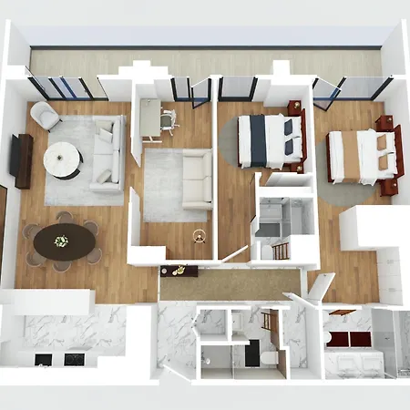 Обладнана кухня оснащена посудомийною машиною і духовкою.